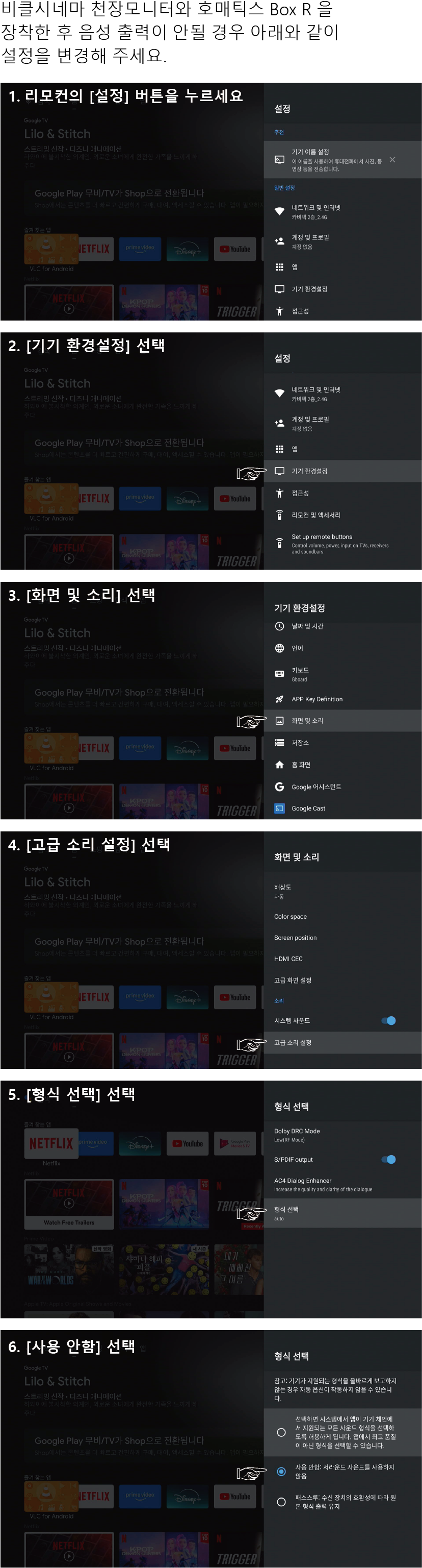 8. 호매틱스 Box R 음성 출력이 안될 경우 최고관리자 조회 546회 2025-08-03 17:36 호매틱스 Box R 음성 출력이 안될 경우 이전글9. 호매틱스 Box R 통합리모컨 설정방법 다음글7. USB 메모리의 동영상 시청 방법 목록