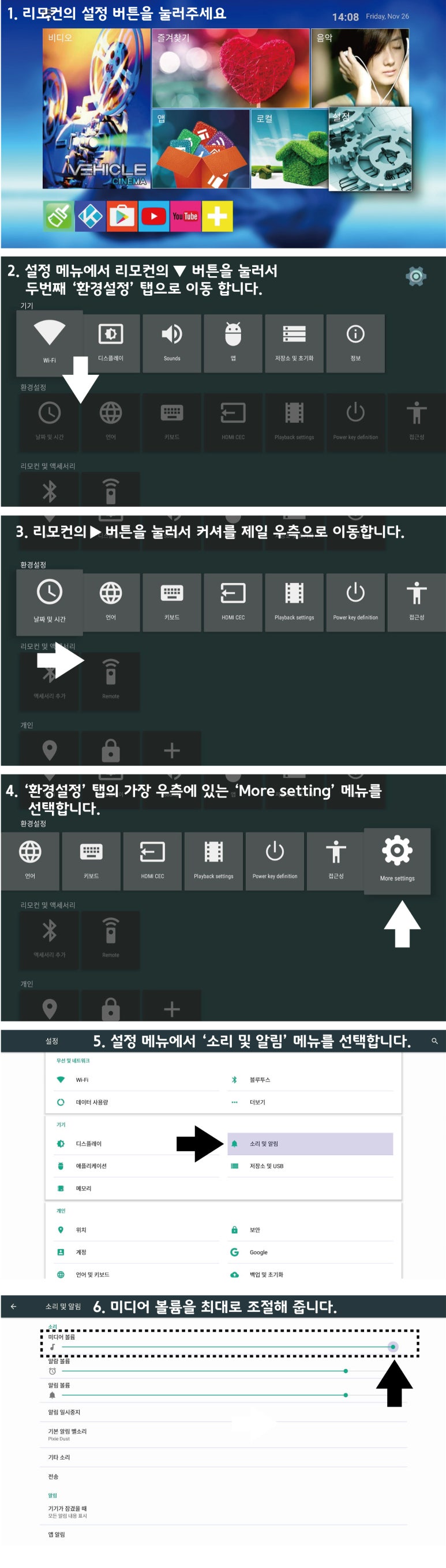 2. 갑자기 음성이 나오지 않을 경우 (VC-173AD, 156AD, 116JUN 모델) 최고관리자 조회 622회 2025-07-23 15:55 갑자기 음성이 나오지 않을 경우 아래와 같이 설정을변경해 주세요 이전글3. 24인치 천장모니터 (VC-240ST) 차량 장착 방법 다음글1. 비클시네마 공식 블로그 목록
